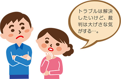 また、トラブルを解決したいのはやまやまだけど、裁判までするには大げさな感じがするし、一度裁判になれば時間や費用も随分かかりそう、という心配もあるかもしれません