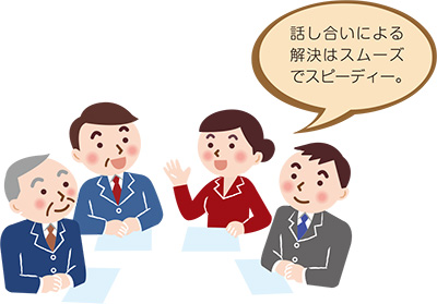 民間事業者が行うADRでは、当事者と利害関係のない公正中立な第三者が「調停人」としてトラブルになった当事者の間に入り、双方の言い分をよく聴いて、専門家としての知見を活かして話し合いによって柔軟な解決を図ります。